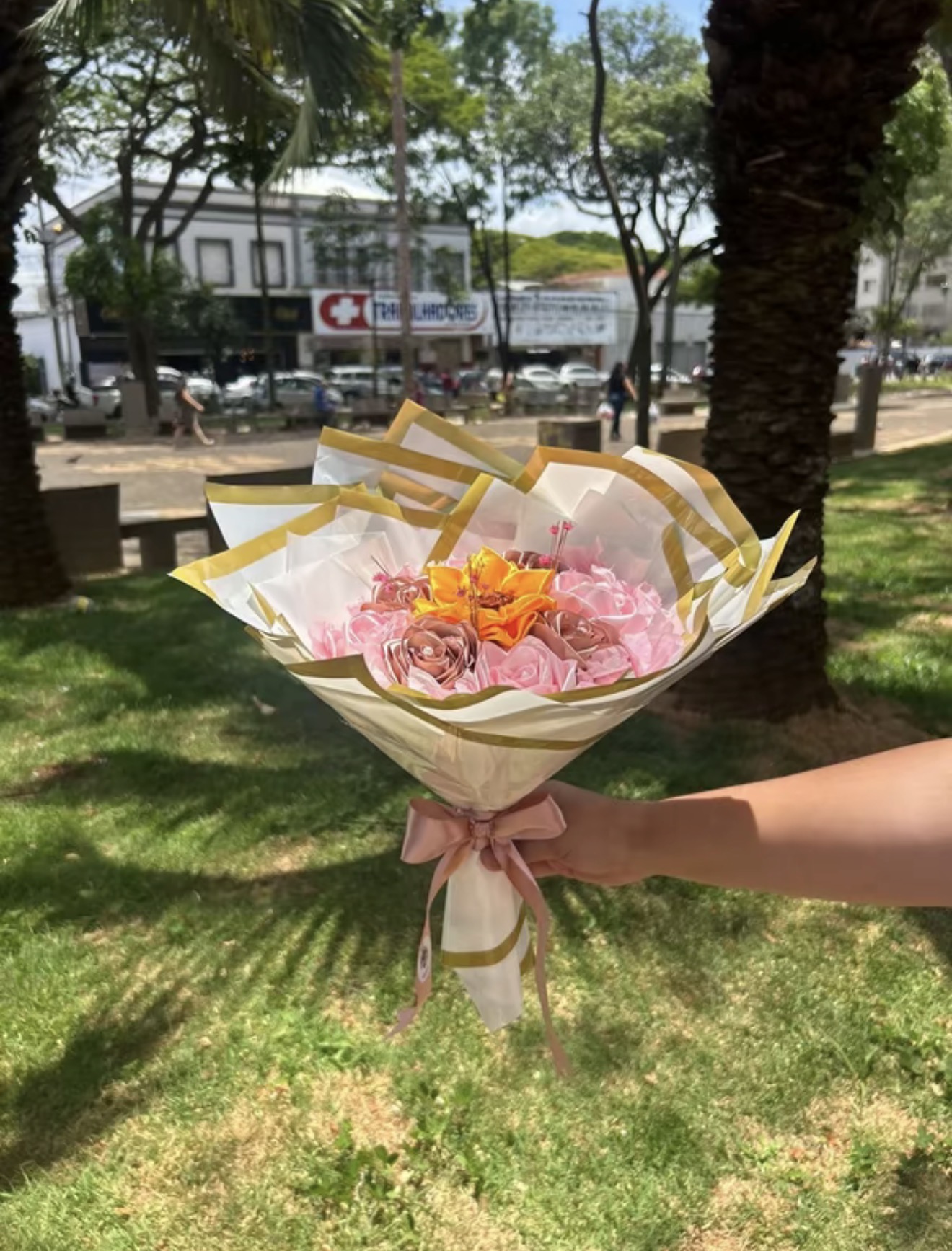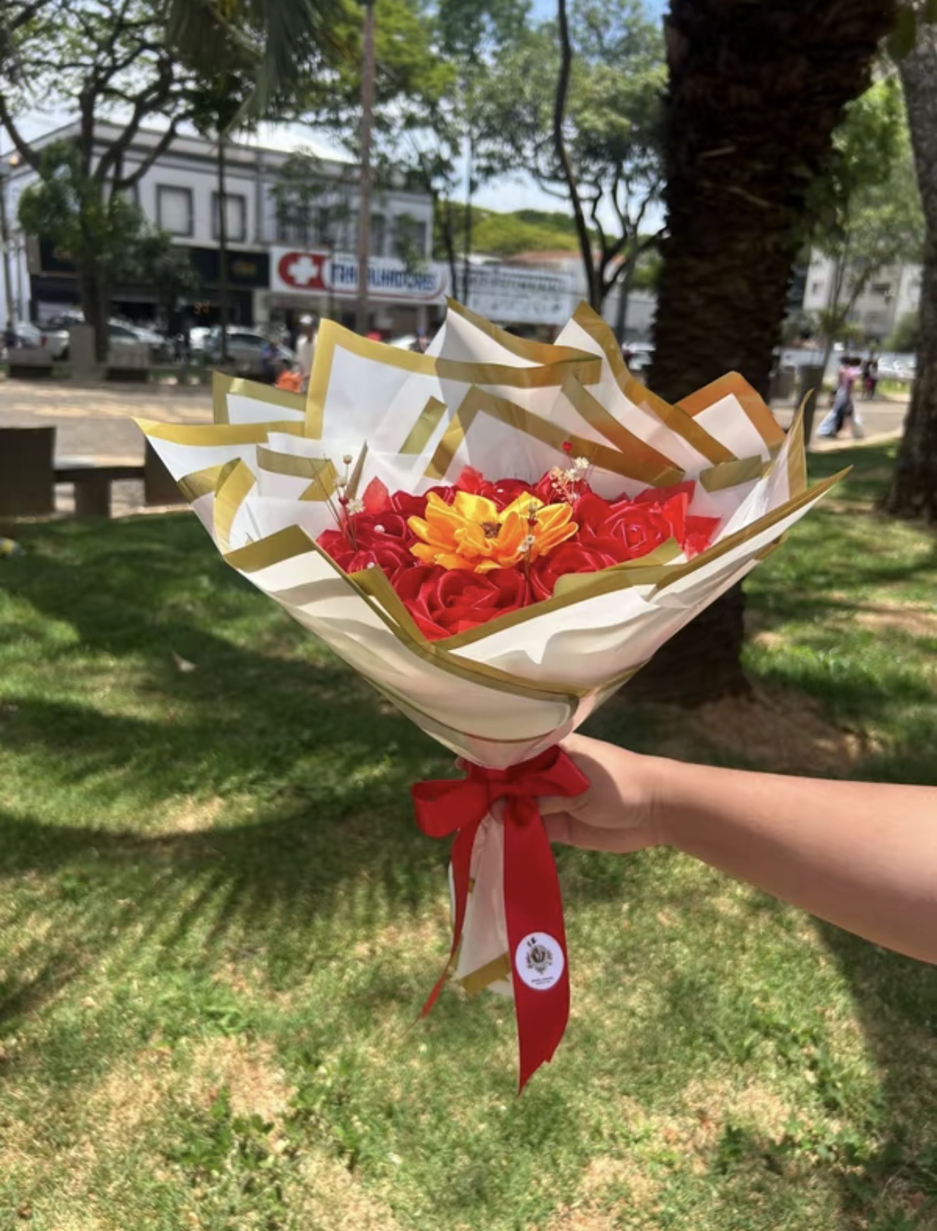 Buque de 8 rosas de cetim com 1 girassol e perolas quantidade
