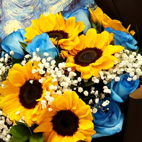 Inspirado na obra Noite estrelada de Van Gogh o Buque de Girassóis, rosas azuis com gypsophila tenta expressar e catalisar essa essência de vitalidade e constância todos em um único buque. Para presentear com classe e estilo, os girassóis junto com a Rosas Azuis representam esse momento de grandiosidade e alegria. Surpreenda!