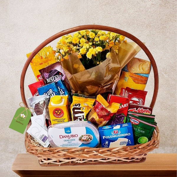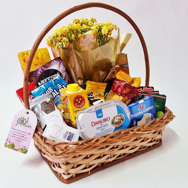Linda cesta de vime decorada para presente e decorada com flores, e produtos para um delicioso café da manhã: um delicado arranjo de flores (kalanchoê, crisântemos, begônias ou flores da época), suco de Frutas 1l, Bolo de chocolate, Café Solúvel, Geléria de frutas Homemade, Sachês de Chá, Biscoitos Salgados, Bolinho Bauducco, Cookies Quaquer, Biscoito Waffer Bauducco, Biscoito Clube Social.