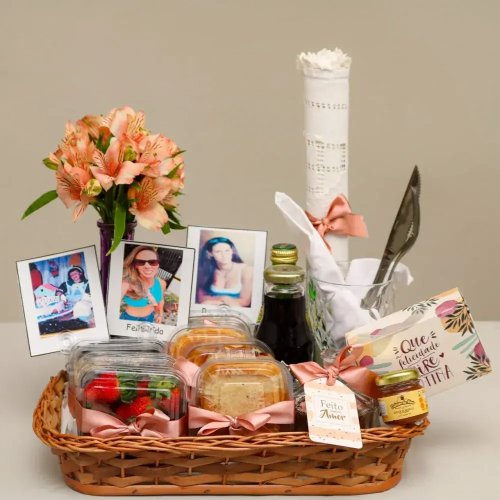Bandeja artesanal em vime com um lindo arranjo de astromelia natural em vaso de vidro