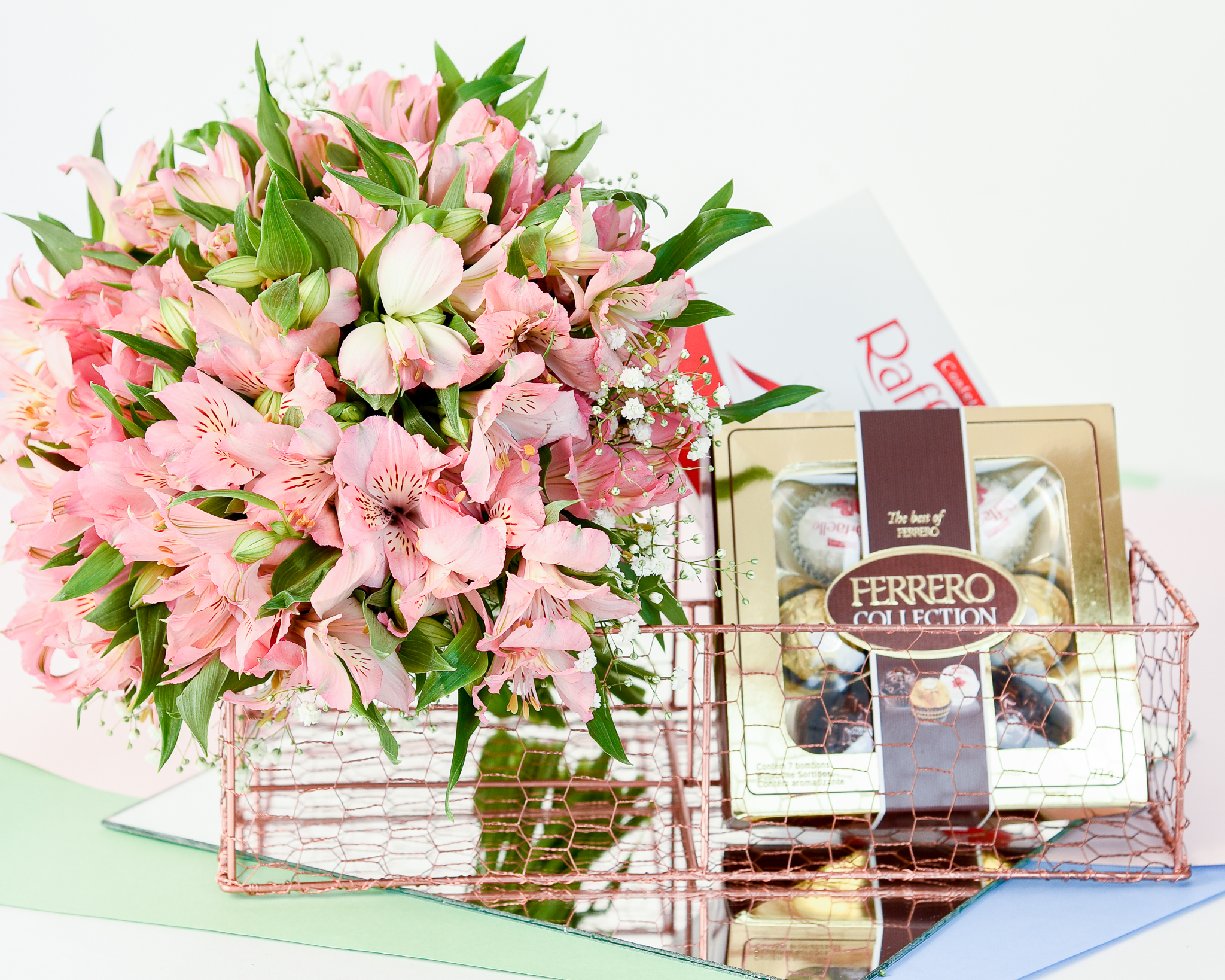 Uma linda cesta composta por um delicado arranjo de astromélias frescas em tons suaves e vibrantes, cuidadosamente dispostas para transmitir elegância e beleza. Ao lado do arranjo, duas delícias irresistíveis: uma caixa de bombons Ferrero Rocher, famosos por sua textura crocante e recheio cremoso, e uma caixa de Rafaello, que combina o sabor único do coco com um toque de amêndoas. Tudo montado em uma cesta charmosa, perfeita para presentear em ocasiões especiais e encantar com sofisticação e carinho.