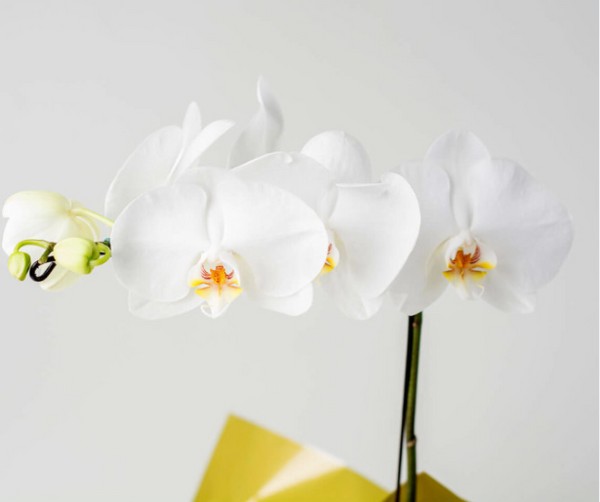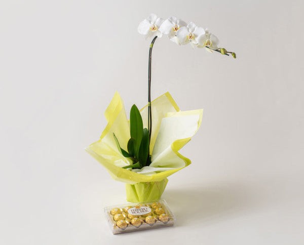 Se você deseja presentear com mais elegância, este conjunto de orquídea Phalaenopsis Branca de uma haste, plantada em um vaso e embrulhada especialmente para presente, acompanhada por bombons Ferrero Rocher ou similar é a opção perfeita!